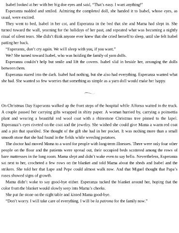 Esperanza’s eyes riveted on the coat and the jewelry. She wished she could give Mama a warm red coat