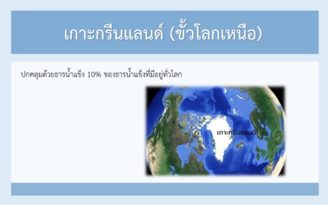 เกำะกรีนแลนด์ (ขั วโลกเหนือ) ปกคลุมด้วยธำรน ้ำแข็ง 10% ของธำรน ้ำแข็งที่มีอยู่ทั่วโลก