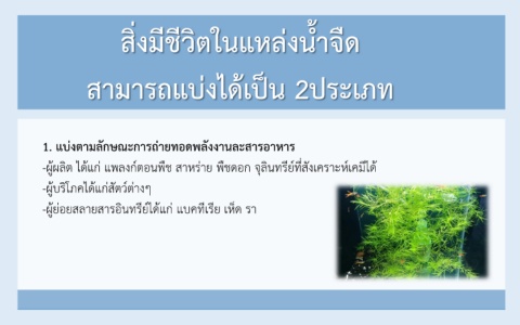 สิ่งมีชีวิตในแหล่งน ้ำจืด สำมำรถแบ่งได้เป็น 2ประเภท 1. แบ่งตำมลักษณะกำรถ่ำยทอดพลังงำนละสำรอำหำร -ผู้ผลิต ได้แก่ แพลงก์ตอนพืช สำหร่ำย พืชดอก จุลินทรีย์ที่สังเครำะห์เคมีได้ -ผู้บริโภคได้แก่สัตว์ต่ำงๆ -ผู้ย่อยสลำยสำรอินทรีย์ได้แก่ แบคทีเรีย เห็ด รำ