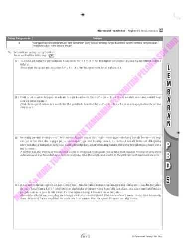 (a) Tunjukkan bahawa persamaan kuadratik 5x + k = (k + 5)x mempunyai punca-punca nyata untuk semua