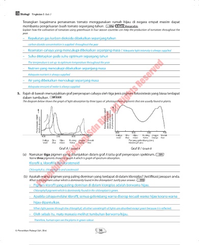 5. Rajah di bawah menunjukkan graf penyerapan cahaya oleh tiga jenis pigmen fotosintesis yang biasa terdapat