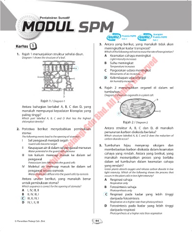 1. Rajah 1 menunjukkan struktur sehelai daun. A Keamatan cahaya meningkat