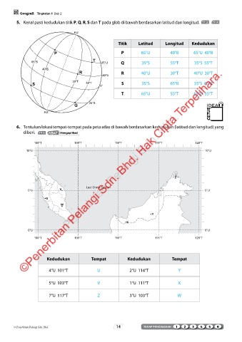 5. Kenal pasti kedudukan titik P, Q, R, S dan T pada glob di bawah berdasarkan latitud dan longitud. TP 3 TP 4