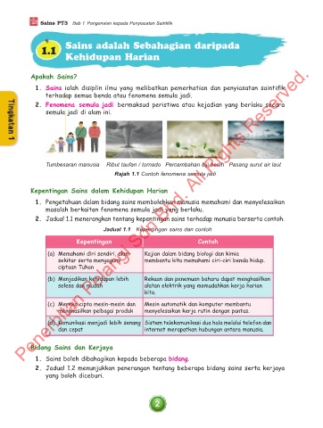 2. Jadual 1.1 menerangkan tentang kepentingan sains terhadap manusia berserta contoh.