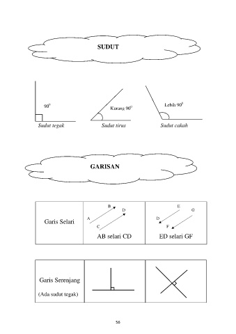 SUDUT 0 0 90 Kurang 90 Lebih 90 0 Sudut tegak Sudut tirus Sudut cakah GARISAN B D E G Garis Selari A D C F AB selari CD ED selari GF Garis Serenjang (Ada sudut tegak) 56