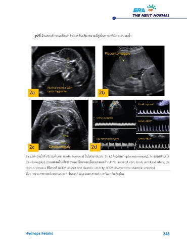 2a แสดงถุงน้ำที่บริเวณต้นคอ (cystic hygroma) ในไตรมาสแรก, 2b แสดงรกหนา (placentomegaly), 2c แสดงหัวใจโต