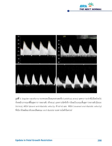 (ขวาบน), AEDV (absent end-diastolic velocity: ซ้ายล่าง) และ REDV (reversed end-diastolic velocity)