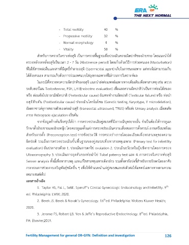 Semen analysis ทั้งนี้เพื่อหาสาเหตุ และแก้ไขสาเหตุเฉพาะดังกล่าว รวมทั้งหาข้อบ่งชี้สำหรับการรักษาโดยอาศย