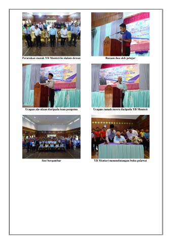 Perarakan masuk YB Menteri ke dalam dewan Bacaan doa oleh pelajar Ucapan alu-aluan daripada tuan pengetua Ucapan ramah mesra daripada YB Menteri Sesi bergambar YB Menteri menandatangan buku pelawat