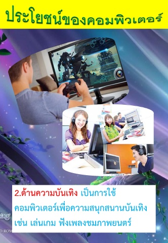 2.ด้านความบันเทิง เป็นการใช้ คอมพิวเตอร์เพื่อความสนุกสนานบันเทิง เช่น เล่นเกม ฟังเพลงชมภาพยนตร์