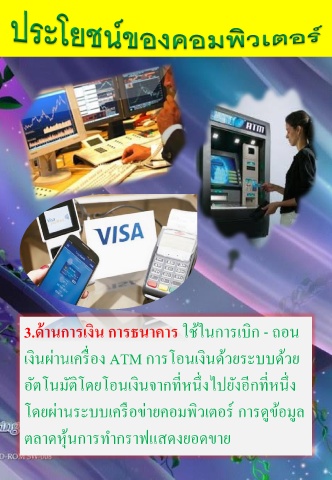 ิ 3.ดานการเงิน การธนาคาร ใช้ในการเบก - ถอน ้ เงนผ่านเครอง ATM การโอนเงนด้วยระบบด้วย ่ ื ิ ิ ่ ึ ี่ ่ ี ึ ิ อัตโนมัตโดยโอนเงนจากทหนงไปยังอกทหนง ิ ี่ ิ โดยผ่านระบบเครอข่ายคอมพวเตอร การดข้อมล ู ื ์ ู ุ ตลาดห้นการท ากราฟแสดงยอดขาย