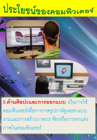็ 5.ด้านศิลปะและการออกแบบ เปนการใช้ ื ู ่ คอมพิวเตอร์เพอการวาดรปการ์ตูนออกแบบ ิ งานและการสร้างภาพกราฟกหรือการตกแต่ง ภาพในคอมพิวเตอร์