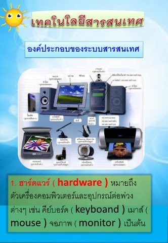 องค์ประกอบของระบบสารสนเทศ 1. ฮาร์ดแวร์ ( hardware ) หมายถึง ิ ตัวเครืองคอมพวเตอร์และอุปกรณ์ต่อพ่วง ่ ต่างๆ เช่น คีย์บอร์ด ( keyboand ) เมาส์ ( ็ mouse ) จอภาพ ( monitor ) เปนต้น