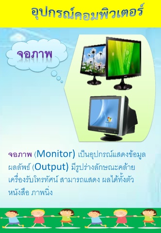 ็ จอภาพ (Monitor) เปนอุปกรณ์แสดงข้อมูล ี ู ผลลัพธ์ (Output) มรปร่างลักษณะคล้าย เครืองรับโทรทัศน์ สามารถแสดง ผลได้ทั้งตัว ่ ่ หนังสือ ภาพนิง