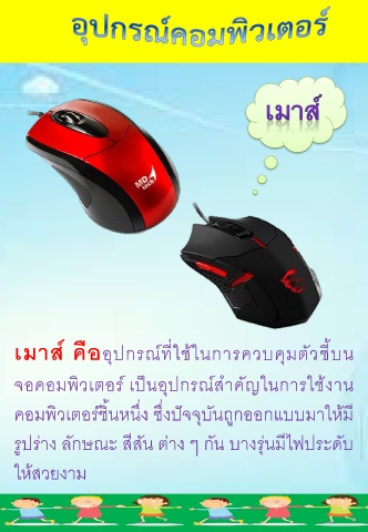 ี ่ เมาส์ คืออุปกรณ์ทีใช้ในการควบคุมตัวช้บน ็ จอคอมพิวเตอร์ เปนอุปกรณ์ส าคัญในการใช้งาน ่ ั ่ คอมพิวเตอร์ช้นหนึง ซึงปจจุบันถูกออกแบบมาให้ม ี ิ ุ ี ู รปร่าง ลักษณะ สีสัน ต่าง ๆ กัน บางร่นมไฟประดับ ให้สวยงาม
