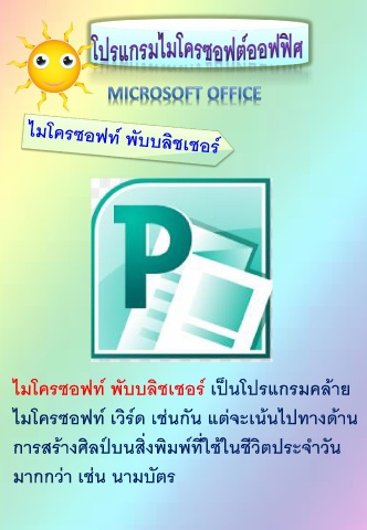 ็ ไมโครซอฟท์ พับบลิชเชอร์ เปนโปรแกรมคล้าย ่ ไมโครซอฟท์ เวิร์ด เชนกัน แต่จะเนนไปทางด้าน ้ ้ ี ิ ้ การสรางศิลปบนส่งพิมพ์ที่ใชในชวิตประจ าวัน ์ มากกว่า เชน นามบัตร ่