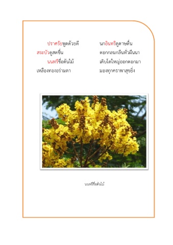 ปราศรัยพูดด้วยดี นกอินทรดูดาษดื่น ี สระบัวดูสดชื่น ดอกกลมกลืนทั่วผืนนา ี นนทรชื่อต้นไม้ เติบโตใหญ่ออกดอกมา เหลืองทองอร่ามตา มองทุกคราพาสุขยิ่ง นนทรีชื่อต้นไม้