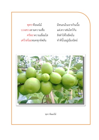 พุทราคือผลไม้ มีหนอนในเจาะกินเนื้อ บวงสรวงตามความเชื่อ แด่เทวาเซ่นไหว้กัน ศรัทธาความเลื่อมใส สิ่งทำให้ใจยึดมั่น เศร้าสร้อยหมดทุกข์พลัน ทำดีนั้นอยู่เนืองนิตย์ พุทราคือผลไม้