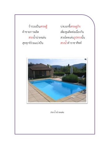 ี้ ร่ำรวยเป็นเศรษฐี บ่งบอกชเศรษฐกิจ ค้าขายการผลิต เพิ่มพูนติดต่อเนื่องกัน สระน้ำน่าลงเล่น สวยโดดเด่นรูปทรงนั้น สุขทุกข์ร่วมแบ่งปัน สรงน้ำคำราชาศัพท์ สระน้ำน่าลงเล่น