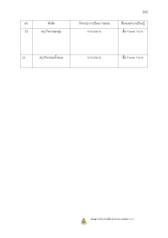 212 สป หัวข้อ กิจกรรมการเรียนการสอน สื่อ/แหล่งการเรียนรู้ 15 สรุปกิจกรรมกลุ่ม การบรรยาย สื่อ Power Point 16 สรุปกิจกรรมทั้งหมด การบรรยาย สื่อ Power Point ั ุ หลักสตรโรงเรยนโคกอเกิ้งฉบับปรบปรง พุทธศักราช 2553 ู ี ี