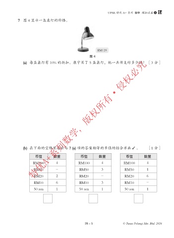 (a) 每盏桌灯有 10% 的折扣。康宁买了 5 盏桌灯,他一共须支付多少钱? [3 分]