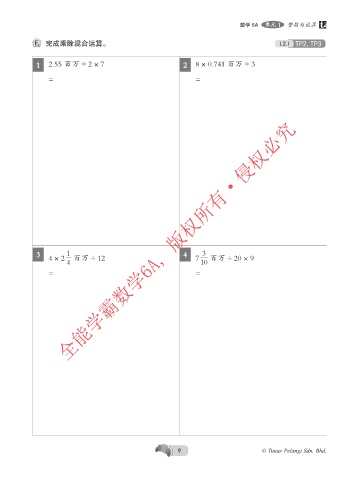 数学 6A. 单元.1 . 整数与运算. F 完成乘除混合运算。 1.2.1 TP2, TP3 1 2.55.百万.÷.2.×.7 2 8.×.0.741.百万.÷.3 =. =. 3 1 4 3 全能学霸数学6A, 版权所有·侵权必究 4.×.2. .百万.÷.12 7. .百万.÷.20.×.9 4 10 =. =. 9 © Tunas Pelangi Sdn. Bhd. 01 All Round Learning MM 6A_p1-20.indd 9 19/01/2022 9:16 AM