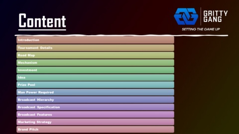 Content Introduction Tournament Details Road Map Mechanism Investment Idea Prize Pool Man Power Required Broadcast Hierarchy Broadcast Specification Broadcast Features Marketing Strategy Brand Pitch