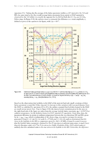 Figure 4-84: Variations in lattice parameter versus ϕ (angle from RD) for hydride phase rings (a) (1 1 1) and (b) (2 2 0)