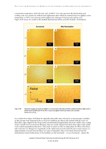 Figure 4-98: Optical micrographs of hydride precipitates in the as-received (left) state and after hydride reorientation (right) under a