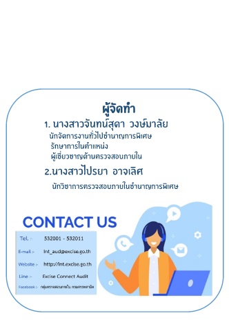 ผู้จัดท า 1. นางสาวจันทน์สุดา วงษ์มาลัย นักจัดการงานทั่วไปช านาญการพิเศษ รักษาการในต าแหน่ง ผู้เชี่ยวชาญด้านตรวจสอบภายใน 2.นางสาวไปรยา อาจเลิศ นักวิชาการตรวจสอบภายในช านาญการพิเศษ