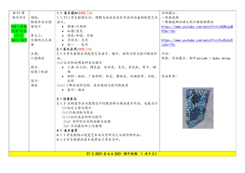 8/3-9/4 领域: 1.1.2(i)学生能够认识、理解与说出在美术作品内涵盖的视觉艺术 ·观看视频