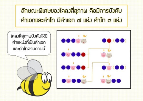 ลักษณะพิเศษของโคลงสี่สุภาพ คือมีการบังคับ ค าเอกและค าโท มีค าเอก ๗ แห่ง ค าโท ๔ แห่ง โคลงสี่สุภาพบังคับให้มี ็ ต าแหน่งที่เปนค าเอก ี้ และค าโทตามภาพน