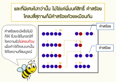 และที่พิเศษไปกว่านั้น ไม่ใช่แค่พี่มนต์สิทธิ์ ค าสร้อย โคลงสี่สุภาพก็มีค าสร้อยด้วยเหมือนกัน ี ค าสร้อยจะมีหรือไม่ม ค าสร้อย ้ ก็ได้ ซึ่งจะใชในกรณีที่ ใจความยังไม่ครบถ้วน ั้ เพอท าใหโคลงบทนน ค าสร้อย ื่ ้ ได้ใจความที่สมบูรณ์
