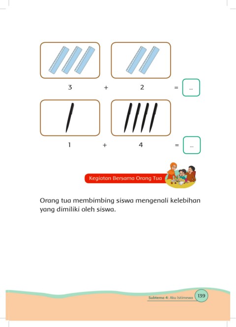 3 + 2 = ... 1 + 4 = ... Orang tua membimbing siswa mengenali kelebihan yang dimiliki oleh siswa. 139 Subtema 4: Aku Istimewa