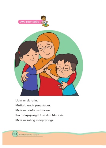 Udin anak rajin. Mutiara anak yang sabar. Mereka berdua istimewa. Ibu menyayangi Udin dan Mutiara. Mereka saling menyayangi. 144 Buku Siswa Kelas 1 SD/MI