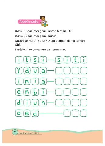 Kamu sudah mengenal nama teman Siti. Kamu sudah mengenal huruf. Susunlah huruf-huruf sesuai dengan nama teman Siti. Kerjakan bersama teman-temanmu. i t s i s i t i y d u a l n i a e n b i d i u n o e d 30 Buku Siswa Kelas 1 SD/MI