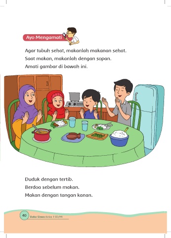 Agar tubuh sehat, makanlah makanan sehat. Saat makan, makanlah dengan sopan. Amati gambar di bawah ini. Duduk dengan tertib. Berdoa sebelum makan. Makan dengan tangan kanan. 40 Buku Siswa Kelas 1 SD/MI