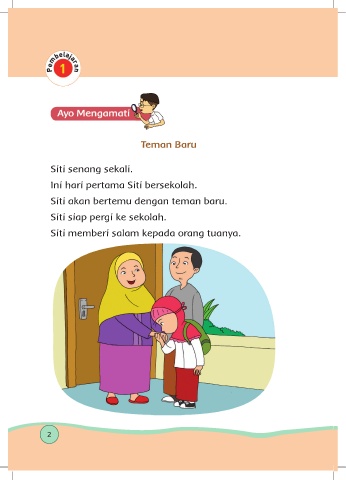Teman Baru Siti senang sekali. Ini hari pertama Siti bersekolah. Siti akan bertemu dengan teman baru. Siti siap pergi ke sekolah. Siti memberi salam kepada orang tuanya. 2