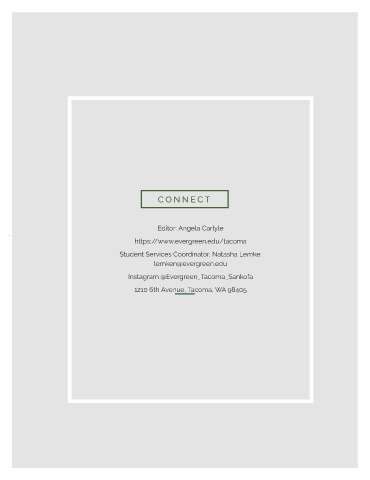 C O N N EC T Editor: Angela Carlyle https:// www.evergreen.edu/ tacoma Student Services Coordinator, Natasha Lemke: lemken@evergreen.edu Instagram @Evergreen_Tacoma_Sankofa 1210 6th Avenue, Tacoma, WA 98405