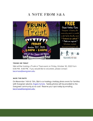 S&A will be hosting a Trunk or Treat event on Friday, October 30, 2020 from This will be a collective gathering to help promote student self cared by