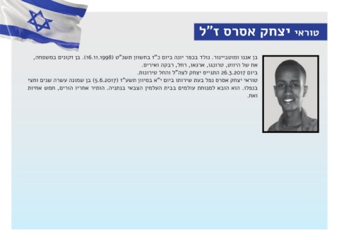 טוראי יצחק אסרס נפל בעת שירותו ביום י"א בסיוון תשע"ז ( )5.6.2017בן שמונה עשרה שנים וחצי