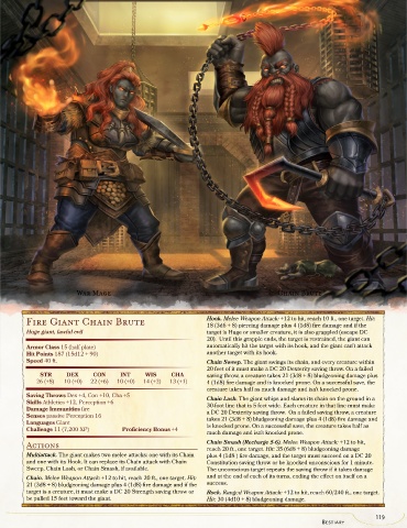 Fire Giant Chain Brute Hook. Melee Weapon Attack: +12 to hit, reach 10 ft., one target. Hit: