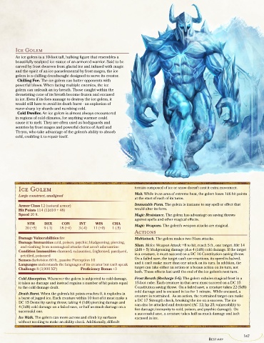 Cold Absorption. Whenever the golem is subjected to cold damage, Frost Breath (Recharge 5-6). The golem exhales magical frost in a