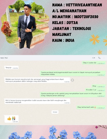Nama : vettriveaanthean a/l mehganathan No.Matrik : 18DDT20F2030 Kelas : DDT3A Jabatan : Teknologi Maklumat Kaum : india