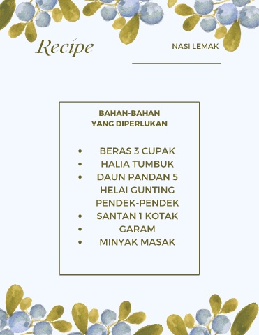 Recipe NASI LEMAK BAHAN-BAHAN YANG DIPERLUKAN BERAS 3 CUPAK HALIA TUMBUK DAUN PANDAN 5 HELAI GUNTING PENDEK-PENDEK SANTAN 1 KOTAK GARAM MINYAK MASAK