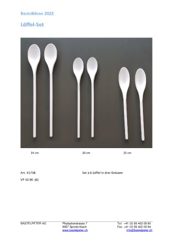 34 cm 30 cm 25 cm Art. 41738 Set à 6 Löffel in drei Grössen VP 10.90 (6) BASTELPETER AG Pfadackerstrasse 7 Tel. +41 (0) 56 402 08 90 8957 Spreitenbach Fax. +41 (0) 56 402 08 94 www.bastelpeter.ch info@bastelpeter.ch