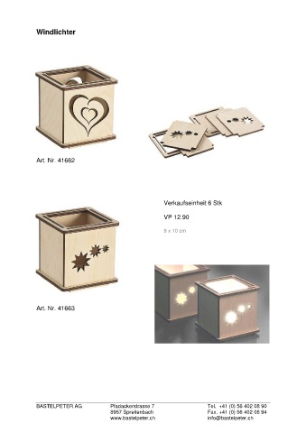 Windlichter Art. Nr. 41662 Verkaufseinheit 6 Stk VP 12.90 9 x 10 cm Art. Nr. 41663 BASTELPETER AG Pfadackerstrasse 7 Tel. +41 (0) 56 402 08 90 8957 Spreitenbach Fax. +41 (0) 56 402 08 94 www.bastelpeter.ch info@bastelpeter.ch