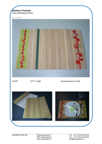 Bambus-Tischset (natur Bambusstreifen) 45 x 30 cm 41370 VP Fr. 5.90 Verkaufseinheit 4 Stk BASTELPETER AG Pfadackerstrasse 7 Tel. +41 (0) 56 402 08 90 8957 Spreitenbach Fax. +41 (0) 56 402 08 94 www.bastelpeter.ch info@bastelpeter.ch