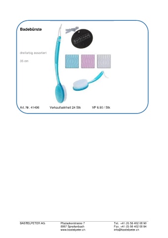 Badebürste dreifarbig assortiert 35 cm Art. Nr. 41496 Verkaufseinheit 24 Stk VP 6.90 / Stk BASTELPETER AG Pfadackerstrasse 7 Tel. +41 (0) 56 402 08 90 8957 Spreitenbach Fax. +41 (0) 56 402 08 94 www.bastelpeter.ch info@bastelpeter.ch