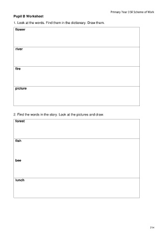 Primary Year 3 SK Scheme of Work Pupil B Worksheet 1. Look at the words. Find them in the dictionary. Draw them. flower river fire picture 2. Find the words in the story. Look at the pictures and draw. forest fish bee lunch 214